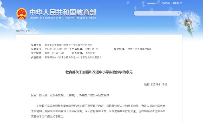 教育部發(fā)布《關于加強和改進中小學實驗教學的意見》(下稱《意見》),《意見》明確,2023年前要將實驗操作納入初中學業(yè)水平考試,考試成績納入高中階段學校招生錄取依據;在普通高中學業(yè)水平考試中,有條件的地區(qū)可將理化生實驗操作納入省級統一考試。