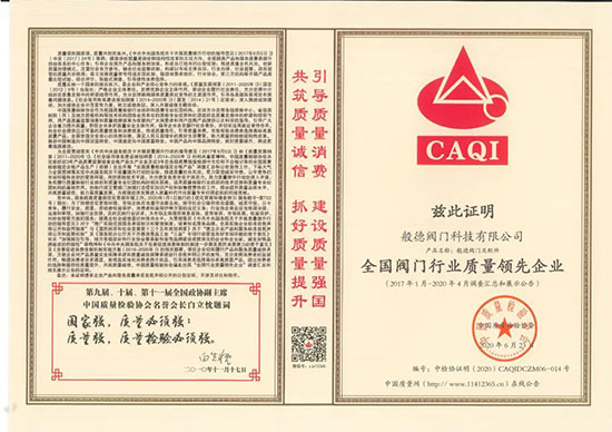 般德閥門榮獲CAQI“全國閥門行業(yè)質量領先品牌”、“全國閥門行業(yè)質量領先企業(yè)”、“全國質量檢驗信譽保障產(chǎn)品”。