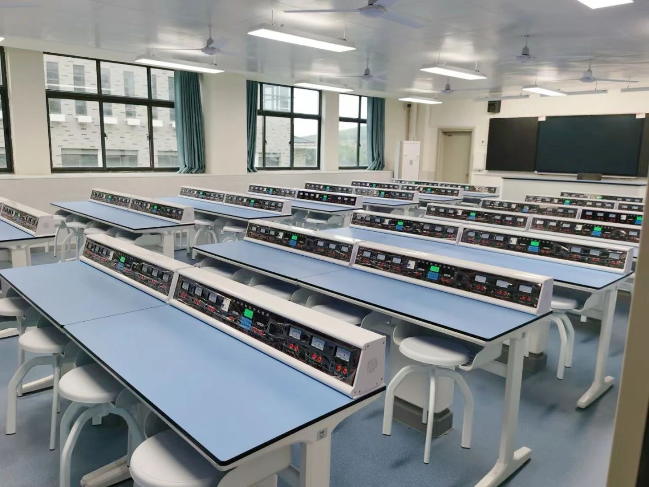 物理電學(xué)實驗室主要由電學(xué)六表電源、學(xué)生實驗桌椅及教師演示臺等核心設(shè)備構(gòu)成。學(xué)生電學(xué)電源采用鋁合金外框設(shè)計,安置于桌面之上,兩側(cè)分別配備了以下設(shè)備:兩個量程為0.6-3A的電流表、兩個量程為3-15V的直流電壓測試表、兩個靈敏電流計測試表。此外,220V交流輸出端口采用新國標(biāo)五孔插座設(shè)計,并配備過載保護功能,確保用電安全。