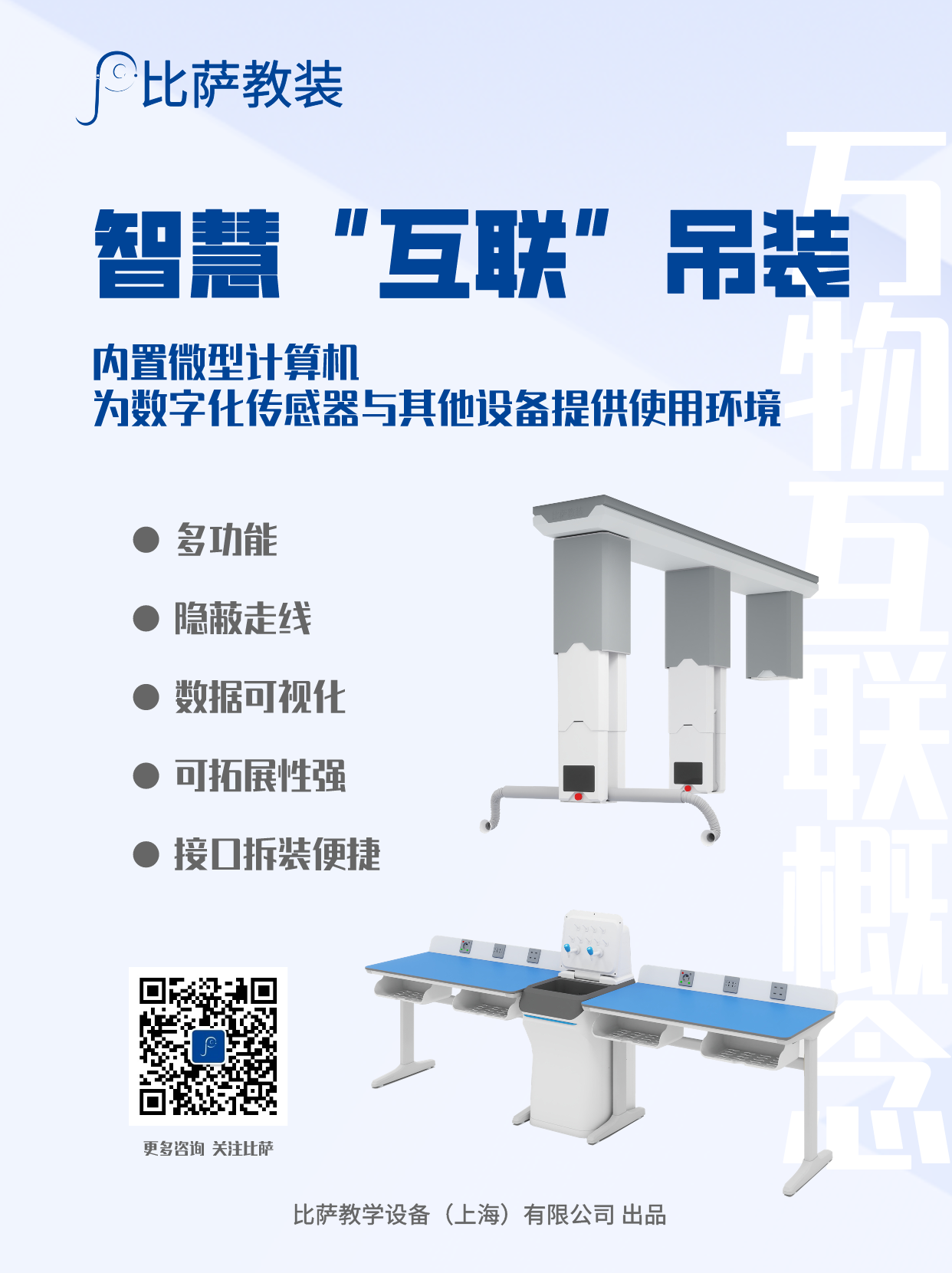 講實(shí)驗(yàn)室所需水、電、光、網(wǎng)絡(luò)等媒介全部至于頂部,為學(xué)科教室的實(shí)驗(yàn)應(yīng)用提供了靈活性。