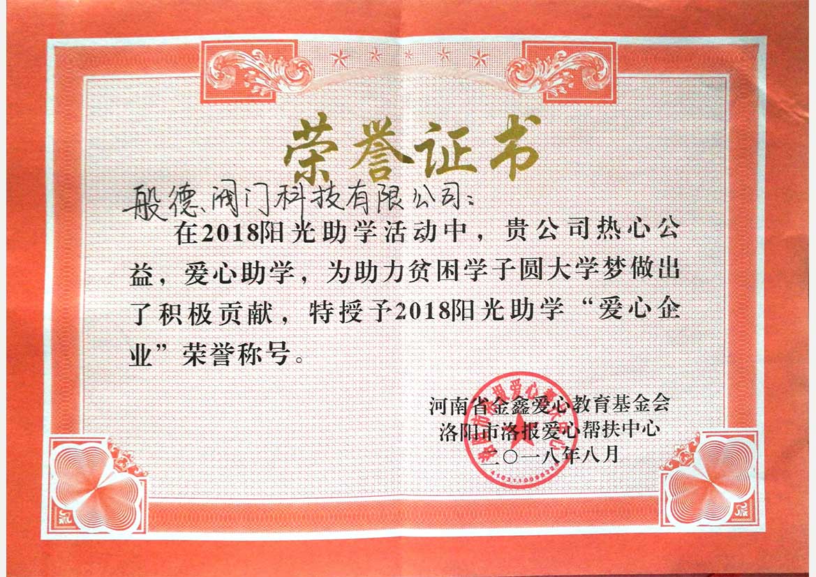 - 2018陽光助學(xué)“愛心企業(yè)”>>查看證書