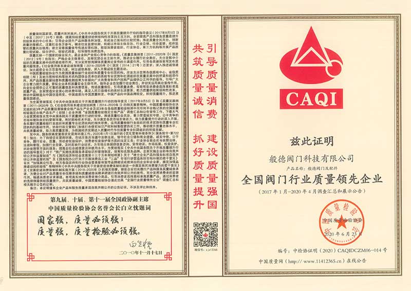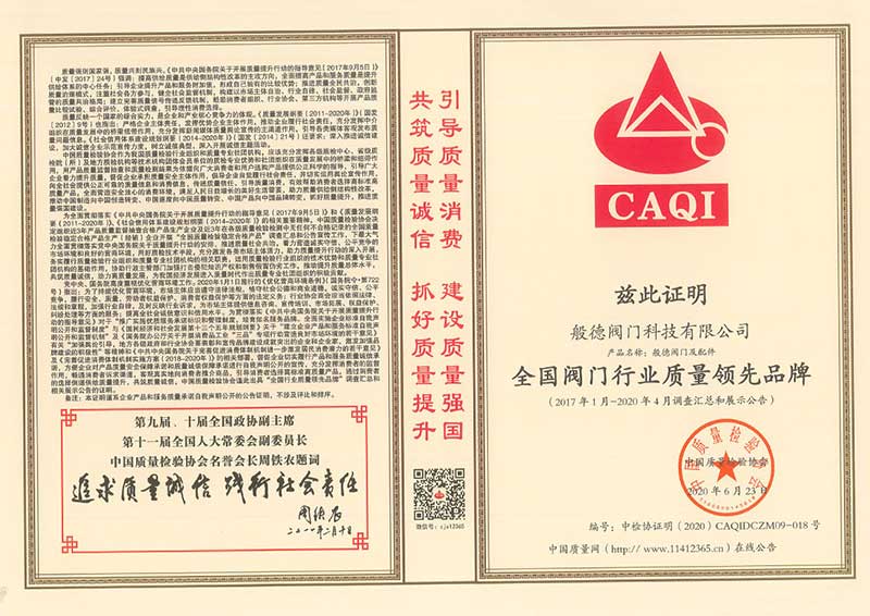 - 全國(guó)閥門行業(yè)質(zhì)量領(lǐng)先品牌>>查看證書