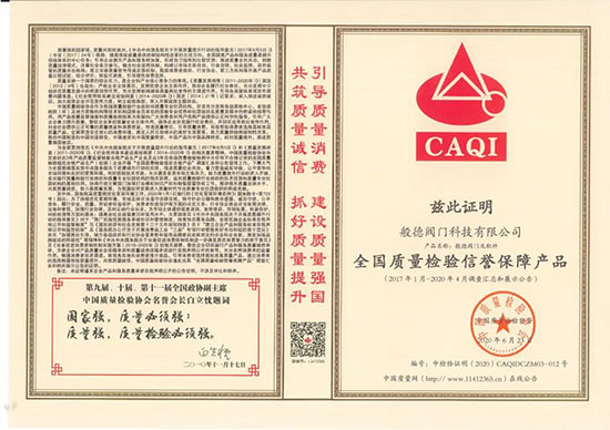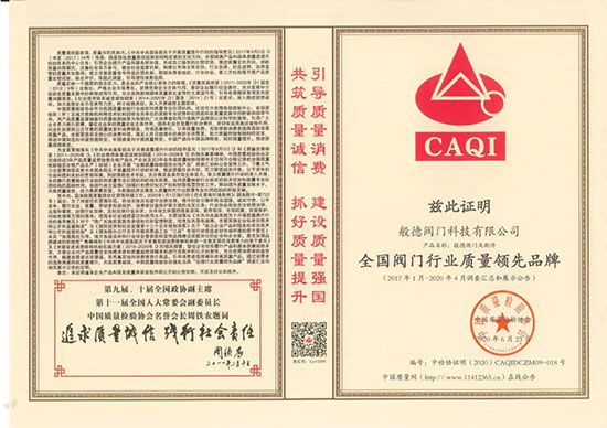 般德閥門榮獲CAQI“全國閥門行業(yè)質量領先品牌”、“全國閥門行業(yè)質量領先企業(yè)”、“全國質量檢驗信譽保障產(chǎn)品”。