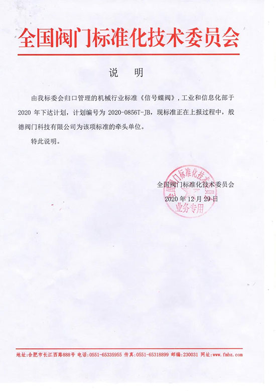 般德閥門是機械行業(yè)標準《信號蝶閥》的牽頭單位,《工業(yè)閥門的逸散性試驗》、《通用閥門 不銹鋼鑄件技術條件》、《鐵制和銅制螺紋連接閥門》、《工業(yè)閥門 壓力試驗》四項標準的起草單位之一。