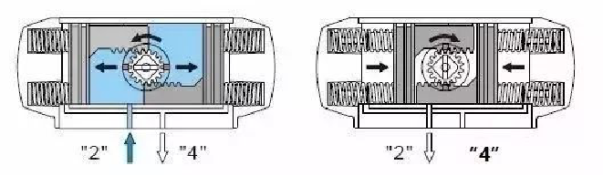 當(dāng)氣源壓力從氣口(2)進(jìn)入氣缸兩活塞之間中腔時,使兩活塞分離向氣缸兩端方向移動,迫使兩端的彈簧壓縮,兩端氣腔的空氣通過氣口(4)排出,同時使兩活塞齒條同步帶動輸出軸(齒輪)逆時針方向旋轉(zhuǎn)。在氣源壓力經(jīng)過電磁閥換向后,氣缸的兩活塞在彈簧的彈力下向中間方向移動,中間氣腔的空氣從氣口(2)排出,同時使兩活塞齒條同步帶動輸出軸(齒輪)順時針方向旋轉(zhuǎn)。(如果把活塞相對反方向安裝,彈簧復(fù)位時輸出軸即變?yōu)榉聪蛐D(zhuǎn))。