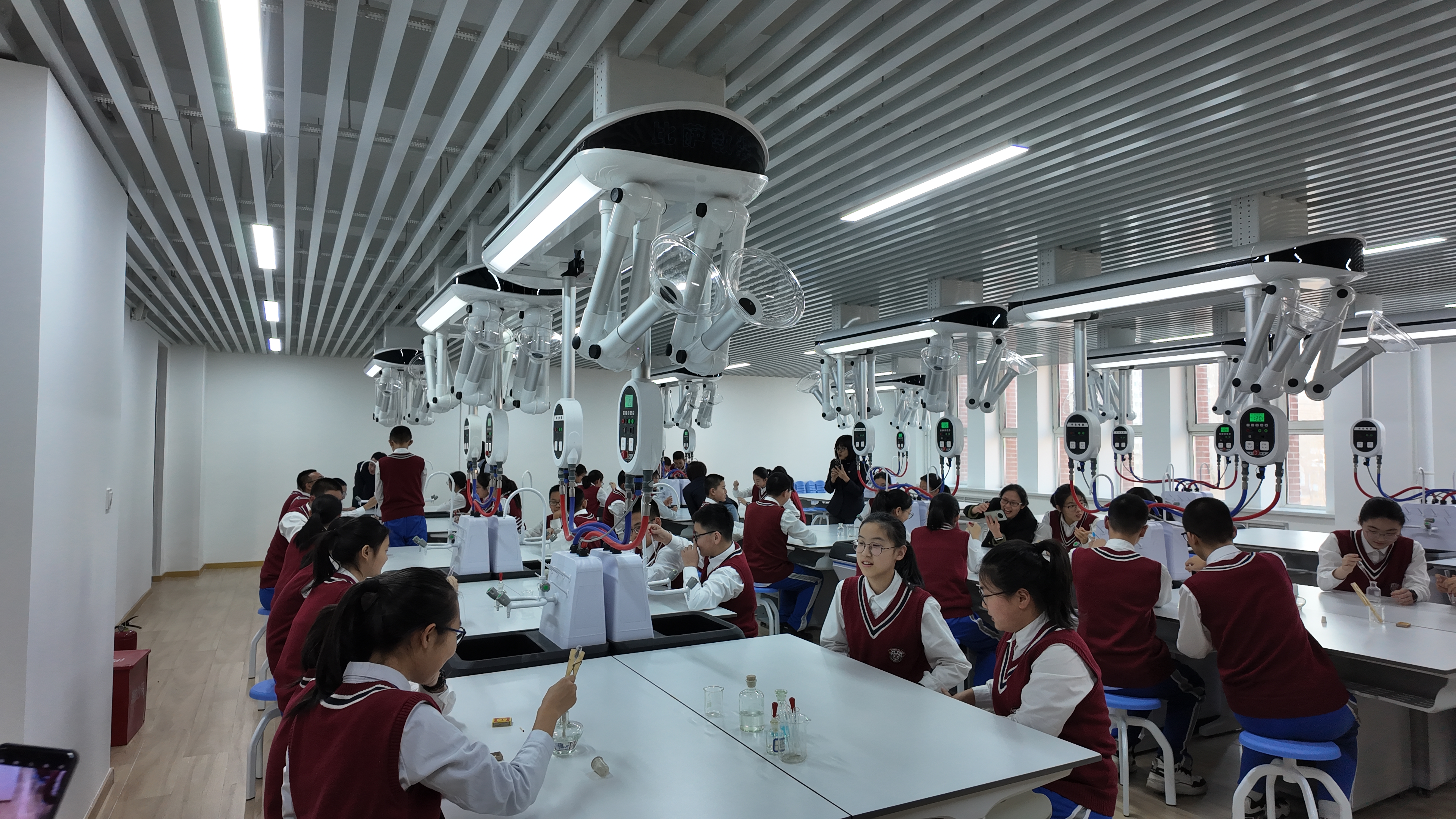 該校將單科實驗室整合升級為8間標準化綜合實驗室,覆蓋理化生多學科需求,解決班級多、教學集中的難題。實驗室配齊供水、供電、排風安全保障系統(tǒng),采用靈活布局適配分組協(xié)作,實行開放式管理,最大化發(fā)揮空間使用效益。